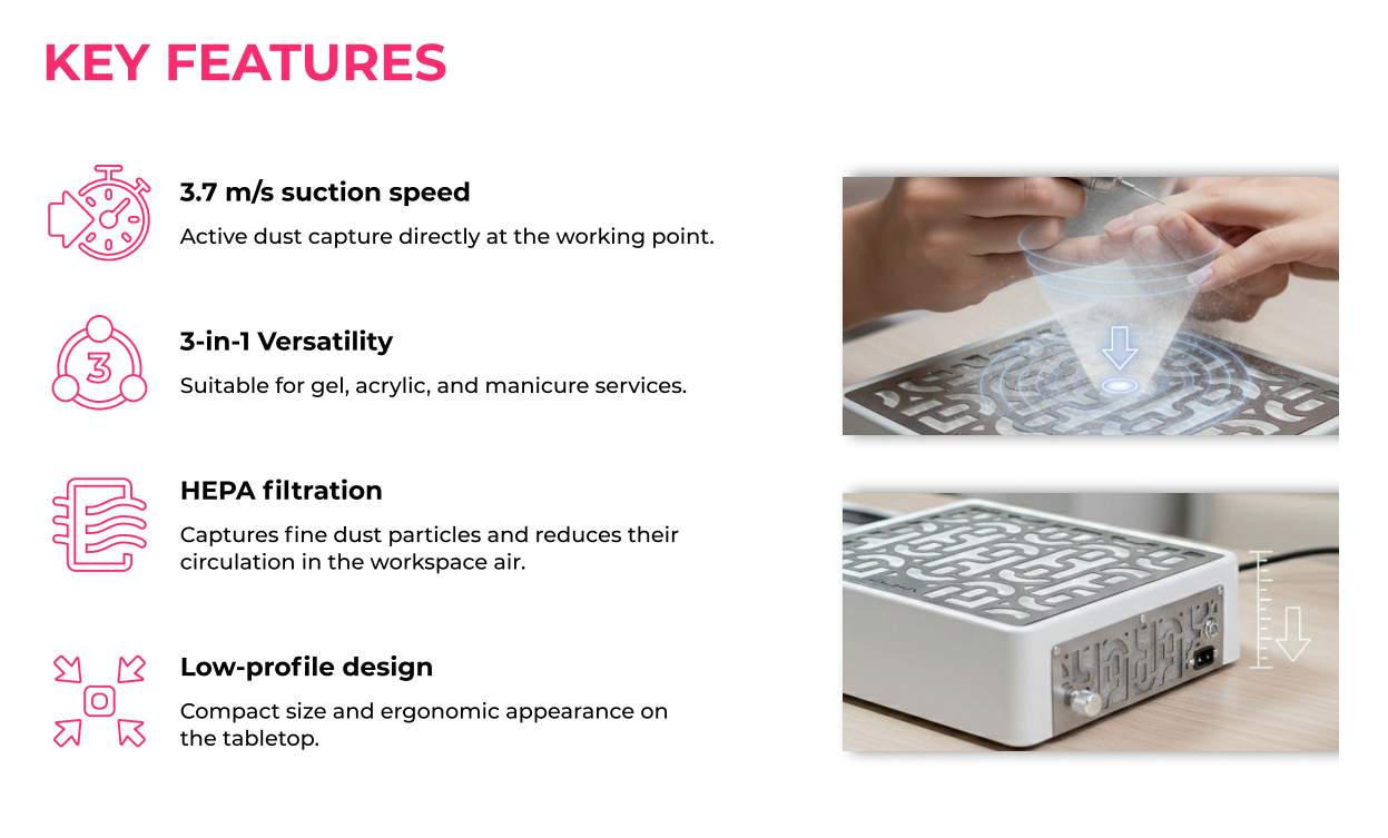 ÜLKA Aero wurde für Nageldesigner:innen und professionelle Anwender:innen entwickelt, die einen Arbeitsplatz in Premium-Qualität zu einem attraktiven Preis suchen. Im Fokus stehen Leistungswerte, die in der Praxis wirklich zählen: lokale Absaugung am Feilpunkt, stabiler Luftstrom und effiziente Filtration.