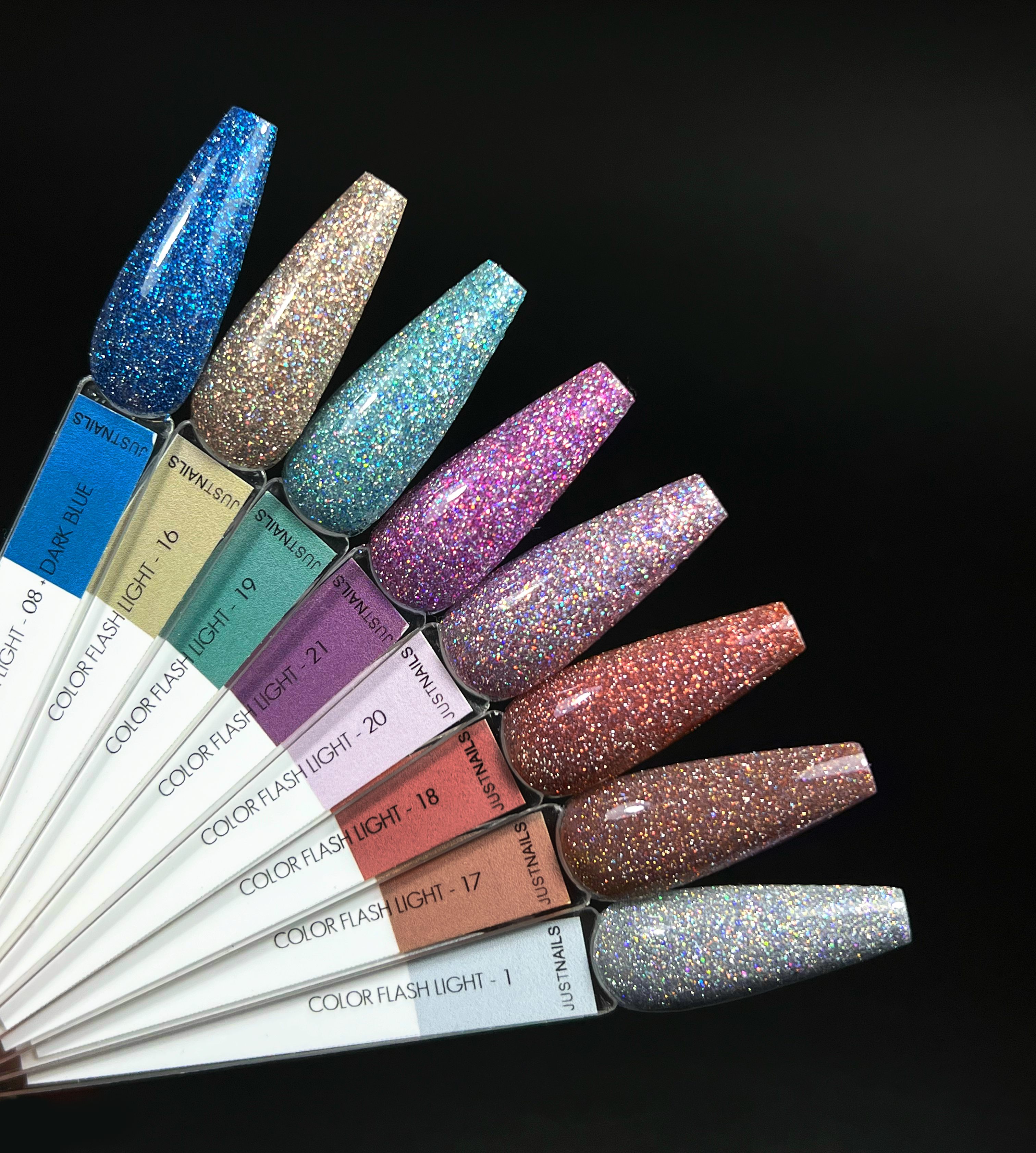 Blitzende Lichter. Mit Licht beginnt alles ... und endet mit Licht! Hergestellt nach moderner Rezeptur. Die Kollektion raffinierter Farben von JUSTNAILS verbirgt zwei Gesichter.